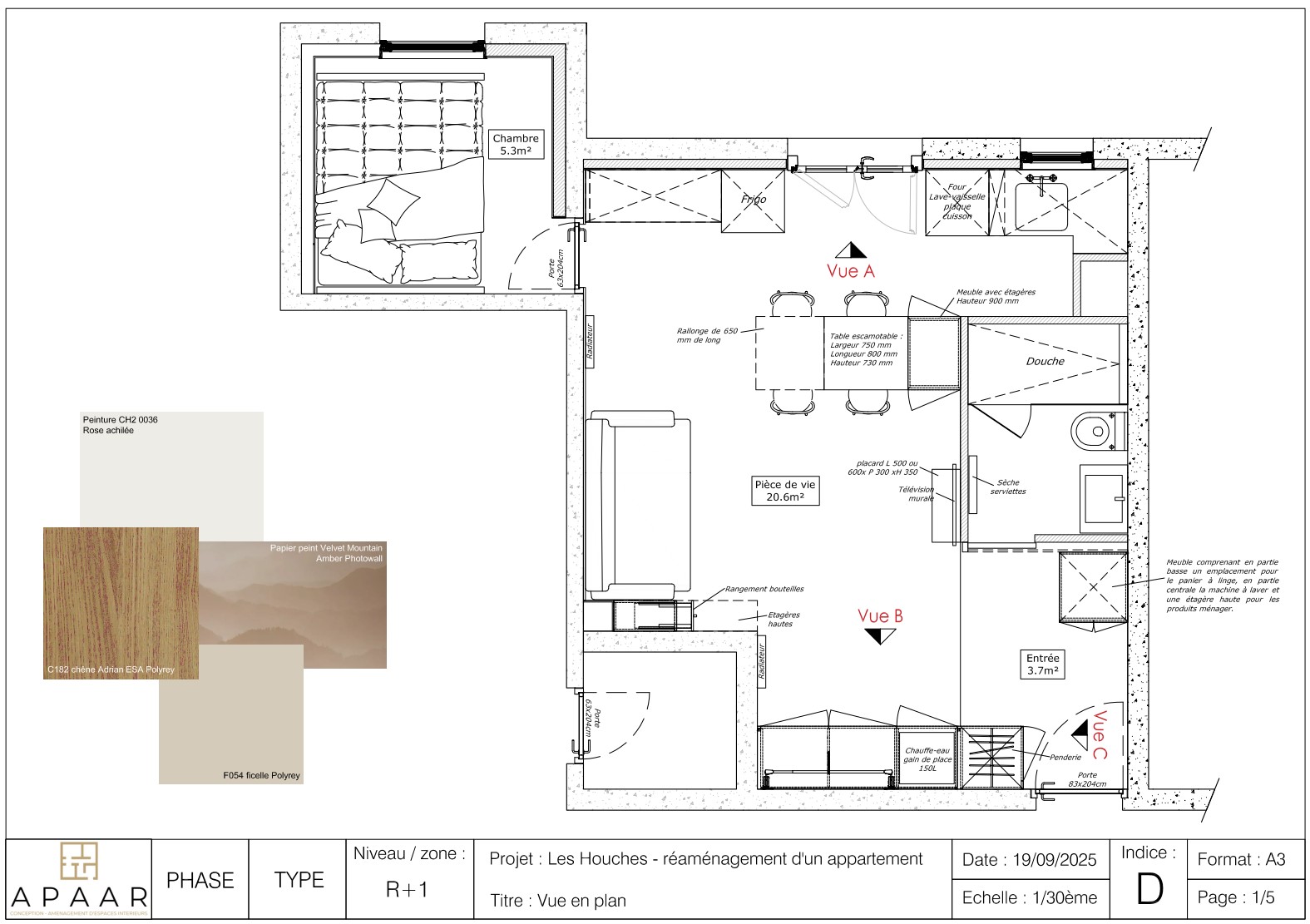 Création d'une chambre, modification de l'espace cuisine et de l'agencement des zones.